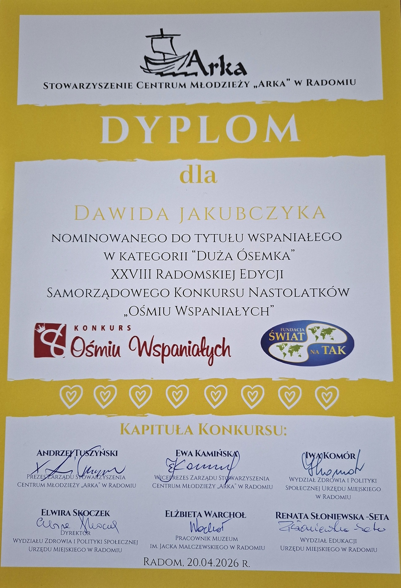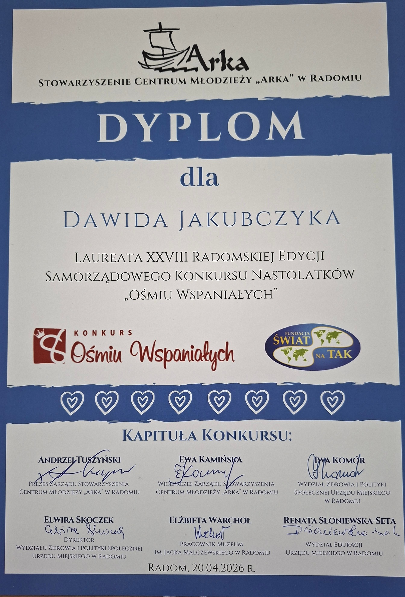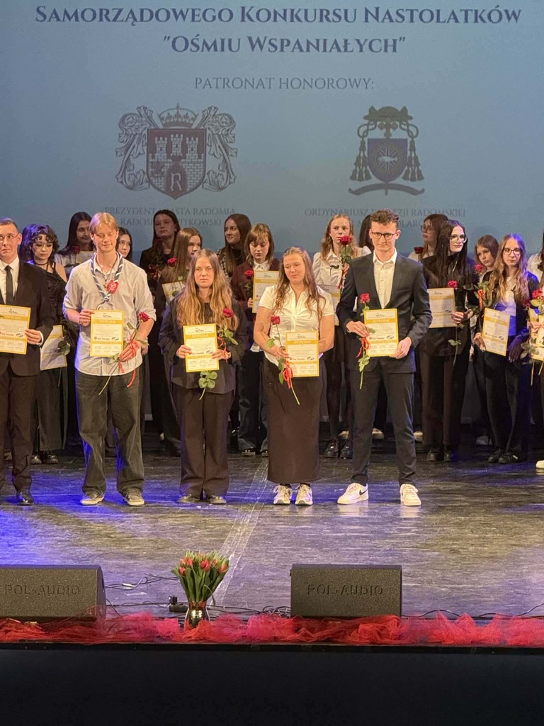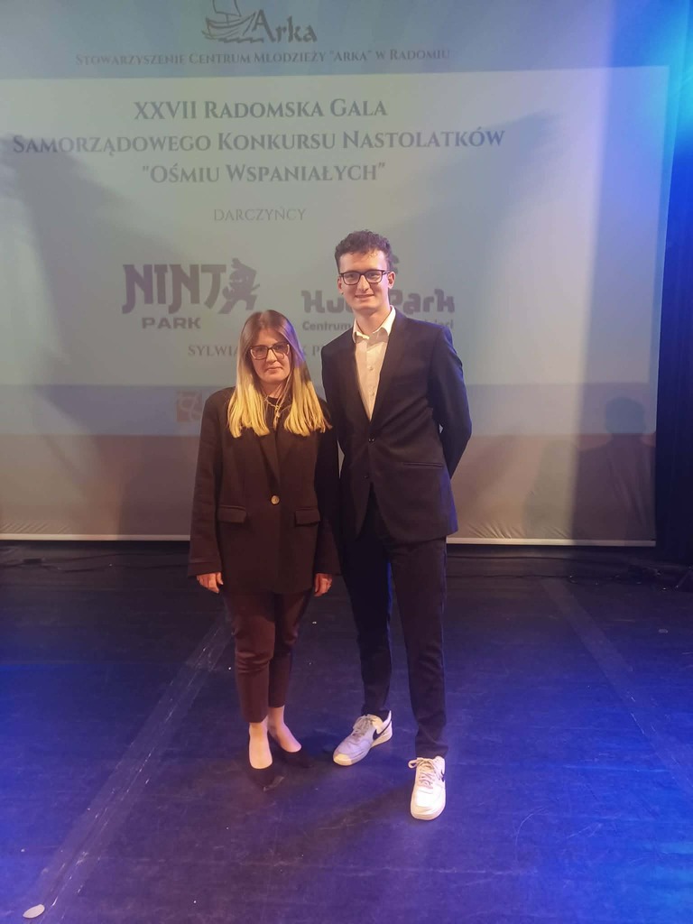 Z ogromną dumą informujemy, że nasz uczeń, Dawid Jakubczyk, został laureatem XXVIII Samorządowego Konkursu Ośmiu Wspaniałych, organizowanego niezmiennie od lat przez Centrum Młodzieży „Arka” oraz Urząd Miejski w Radomiu.