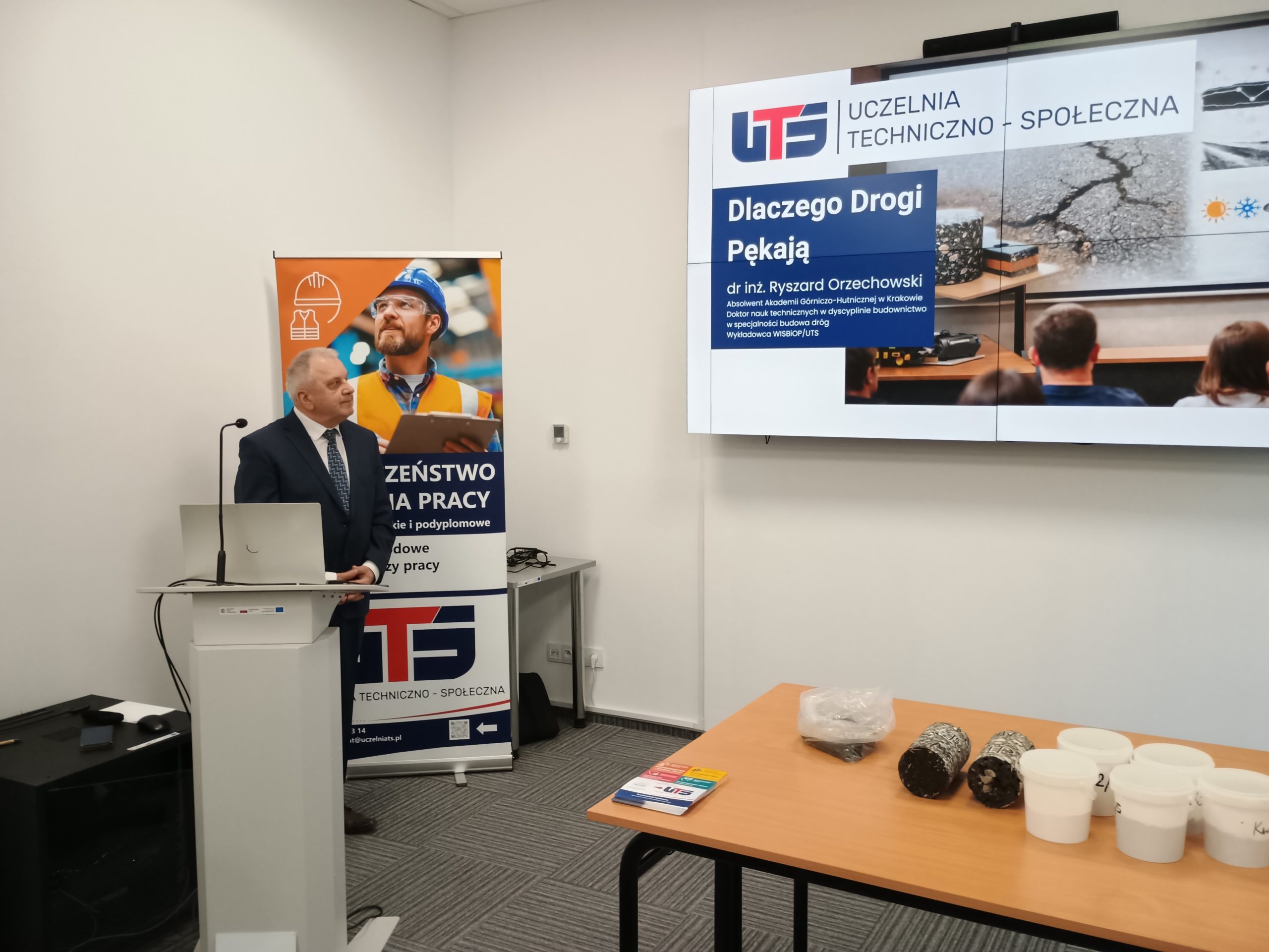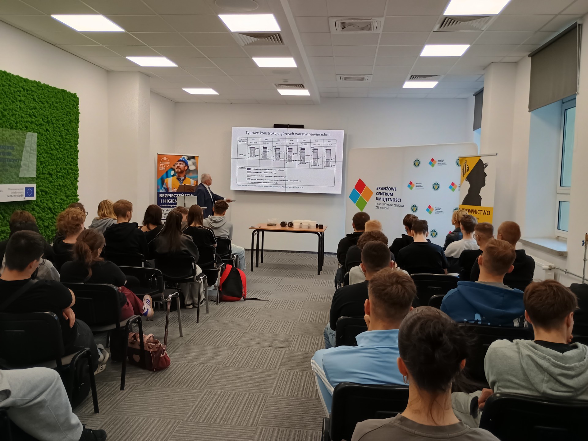 Dnia 23.04.2026 roku w Branżowym Centrum Umiejętności nr 1 przy Zespole Szkół Budowlanych w Radomiu, odbyło się szkolenie poświęcone tematyce budowy dróg. Spotkanie „Dlaczego drogi pękają” poprowadził dr inż. Ryszard Orzechowski – absolwent Akademii Górniczo – Hutniczej w Krakowie, doktor nauk technicznych w dyscyplinie budownictwo (specjalność: budowa dróg), wieloletni kierownik laboratorium Miejskiego Zarządu Dróg i Komunikacji w Radomiu, a obecnie wykładowca Wyższej Inżynierskiej Szkoły Bezpieczeństwa i Organizacji Pracy w Radomiu/ Uczelni Techniczno – Społecznej.