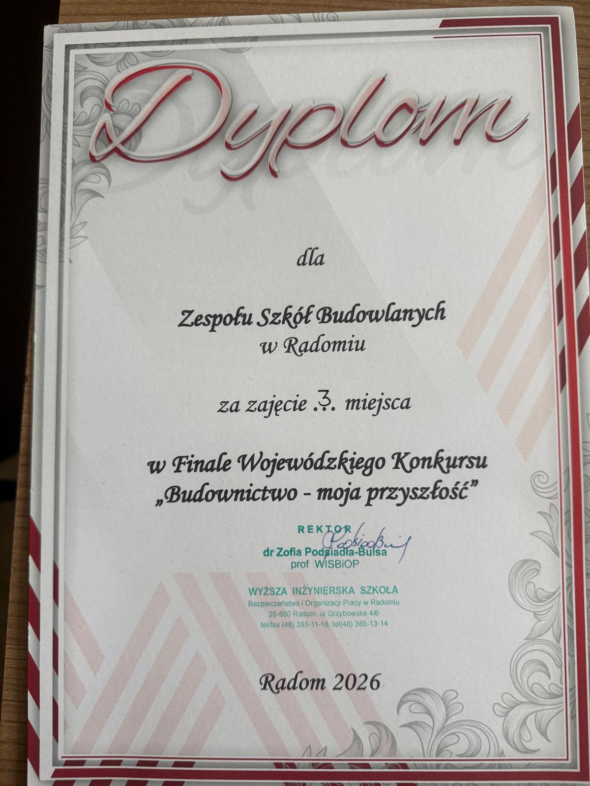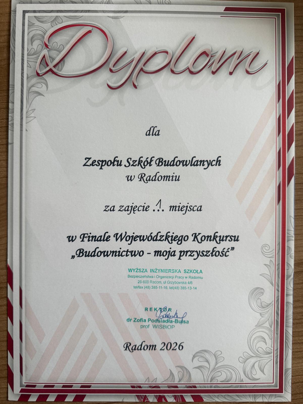 Z przyjemnością ogłaszamy wyniki X Finału Wojewódzkiego Konkursu „Budownictwo moja przyszłość”, który odbył się 17 marca 2026 r. w Wyższej Inżynierskiej Szkole Bezpieczeństwa i Organizacji Pracy. Patronat nad konkursem sprawują: Mazowiecki Kurator Oświaty oraz Mazowiecka Okręgowa Izba Inżynierów Budownictwa. Decyzją Komisji Konkursowej wyłonieni zostali zwycięscy – uczniowie Zespołu Szkól Budowlanych w Radomiu!!!